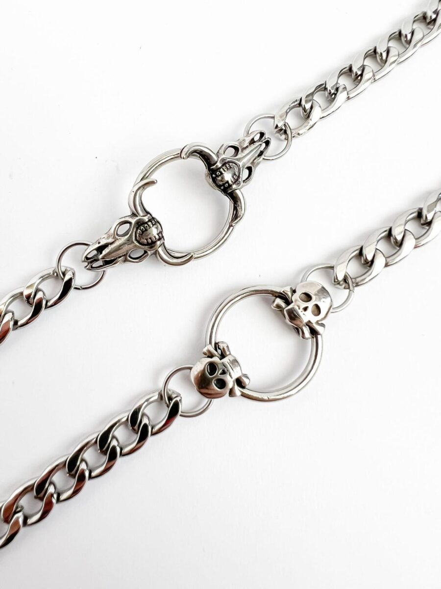 - צמיד גורמט סטיינלס סטייל, עם מרכז חישוק שעליו שתי גולגולות (קלאסיות או שור). צמיד שיושב בצורה מושלמת על פרק כף היד, משתלב גם ביחד עם צמידים נוספים.